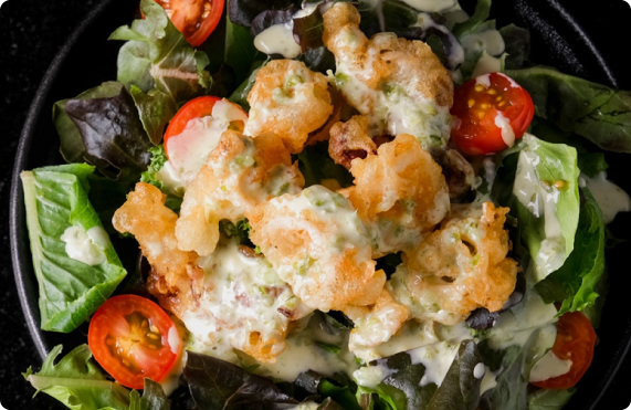 タイで教えてもらったイカフライのサラダです。駐在している時に、現地の社員が自分でレシピを考えられるよう料理を学んでもらったことがあります。その時彼が、キユーピー マヨネーズと、ガーリックやライム果汁などを混ぜたシーフードソースを和えたサラダを作ってくれたんです。タイ風の、とても美味しいサラダになりました。思い出のひと皿です。