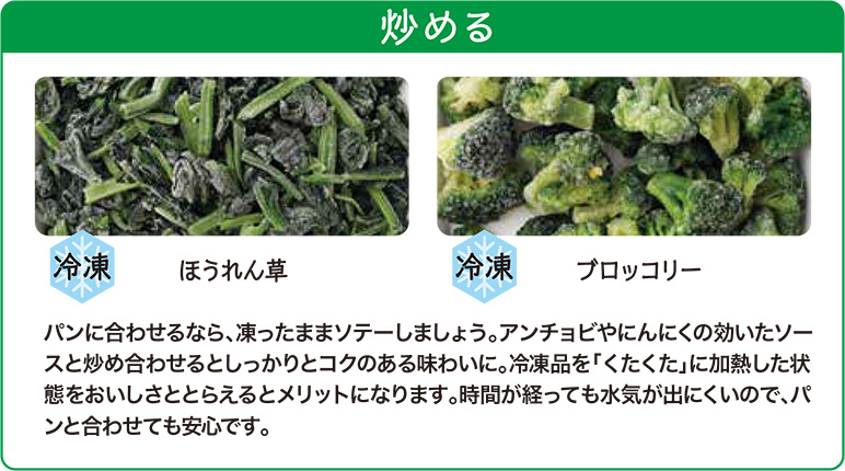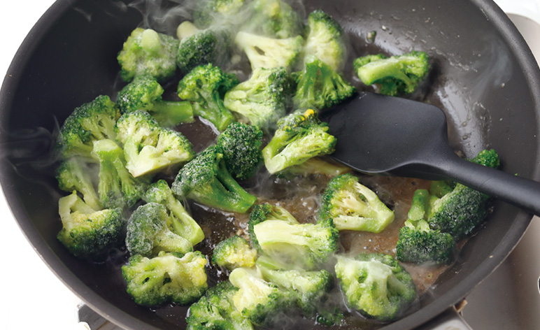 冷凍ほうれん草と冷凍ブロッコリーは扱いやすさも魅力です。カットタイプなら凍ったままソテーして