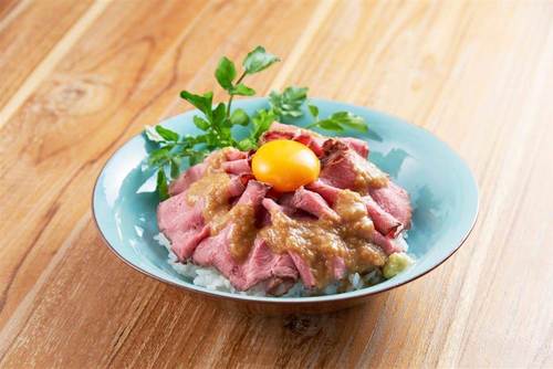 ローストビーフ丼に、にんにくのうま味が効いた具たっぷりソース ガーリックオニオンを合わせました。卵黄やわさびを混ぜ合わせてお召し上がりください。