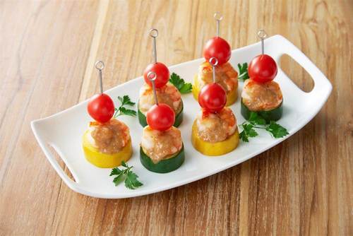 ピックにミニトマト、えび、ズッキーニの順番に刺し、器に盛る。