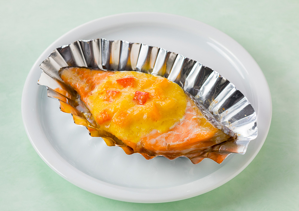 岩手県の特産品のひとつである『鮭』を、おいしく食べてもらいたい!と思い、考えたメニューです。マヨカレーソースは、スパイシーな香りで食欲をそそる、子どもたちが大好きな味です。クリームコーンを加えることで、風味に甘さが加わりまろやかになり、焼き色もきれいなきつね色に仕上がります。カラフルなパプリカを散らすことで、目にも鮮やかかつ食味に変化がある焼き上がりになりました。