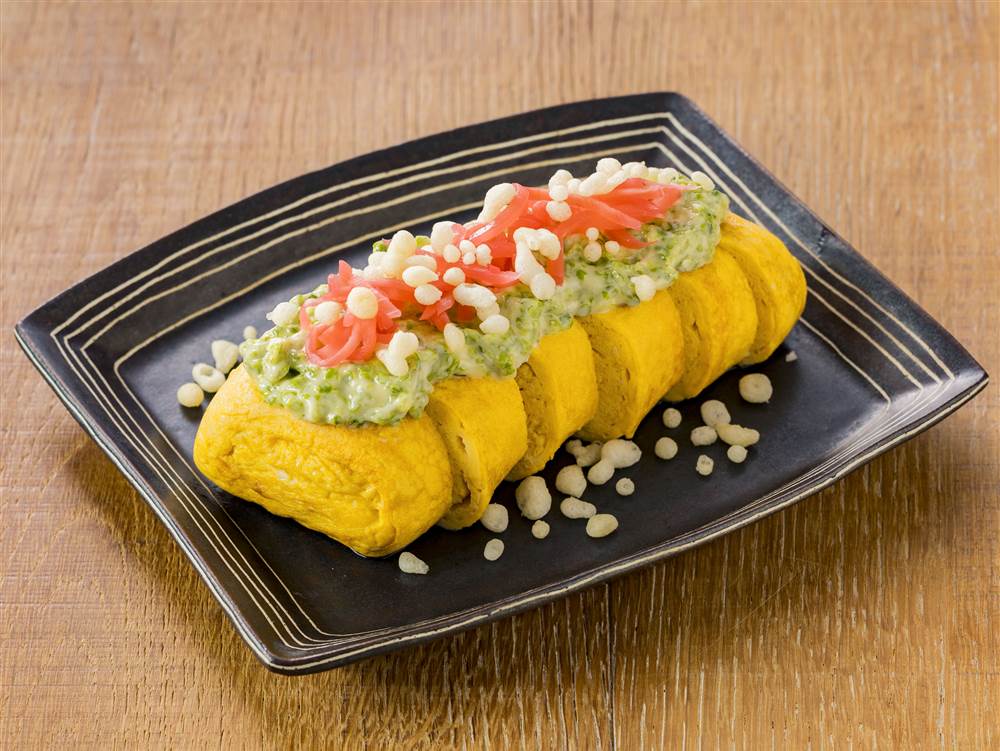 ふんわり焼き上げただし巻き卵に、香り豊かな青のりマヨをたっぷりとかけました。天かすのコクと紅しょうがの酸味がアクセントになり、お好み焼きのような風味の味わいです。