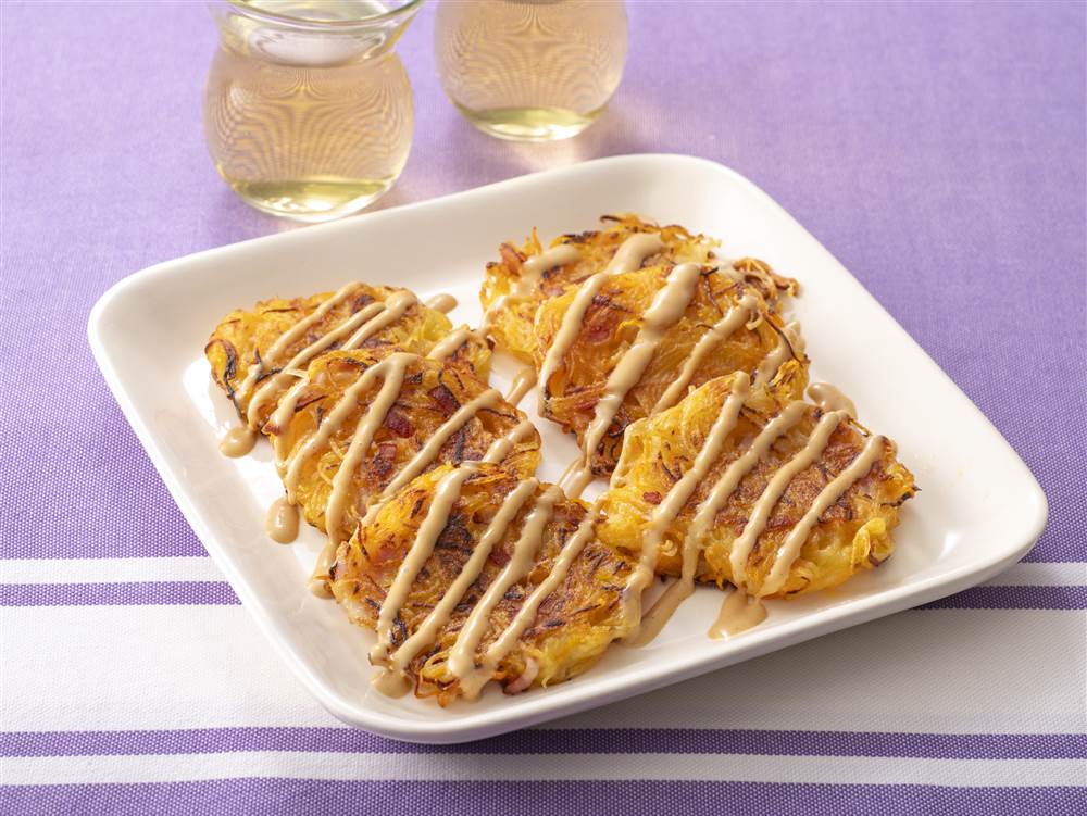 カリっと焼いたじゃがいもとにんじんが香ばしい一口サイズのお好み焼き風のおかずです。